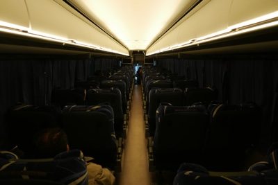 一息ついたので少し寝たいのだが、バスの中のモニターでは早朝から映画の上映をしている。スピーカーからの音がうるさくてぜんぜん寝れない・・・。