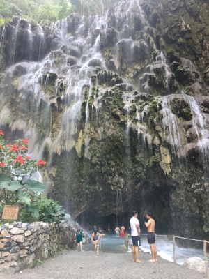 滝と洞窟の温泉に行くまでの周りの景色もすごいな。こんな大きな渓谷の中に一大温泉リゾートがあるなんて楽しそう。入り口の手前のロープに上着とタオルをかけておく。
