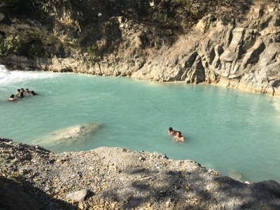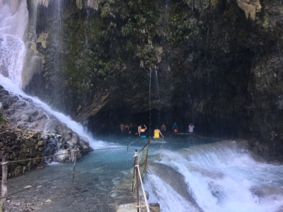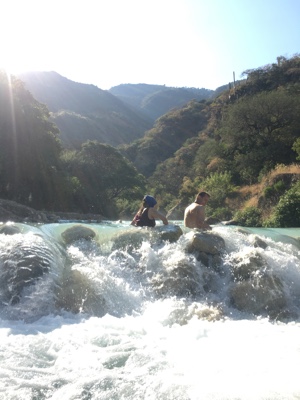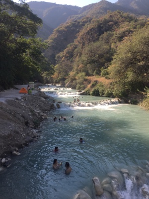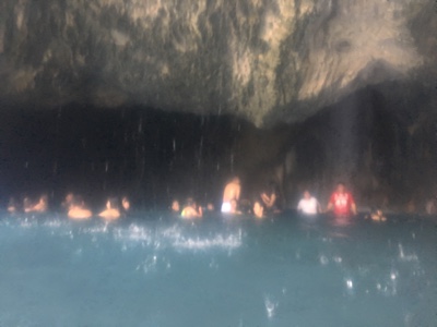 滝の温泉の奥は結構広く流れも速いところもあり、そういうところには水中にロープが張ってありそれをつかんで移動する。日本だったらこんなに流れが速いところで遊泳許可はまず出ないな。この温泉がメキシコにあったからこそ体験できるのだと思うよ。