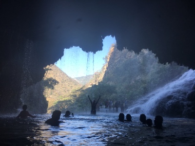 冷たい滝の水をくぐり、滝の裏の温泉に入る。お湯は結構ぬるいな・・・。水中カメラはメキシコシティの北バスターミナルの荷物預かり所のバックパックの中に入れたままなので、iPhoneをジップロックに入れて撮影してみる。曇ってぜんぜん綺麗に映らないや。