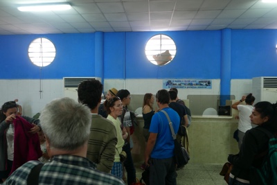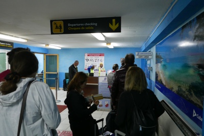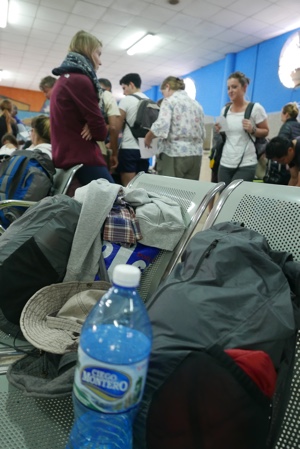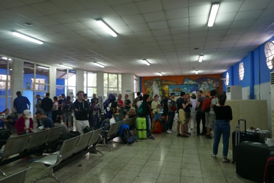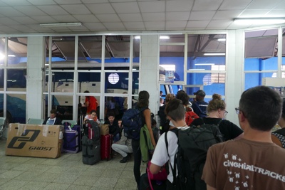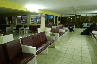 5時に別のバスが到着し、客が降りて来た。空港前は結構な人数になってきたがまだドアに鍵がかかっていて空港内に入れない。そして5時過ぎにやっと中に入ることが出来た。パスポートを見せてチケットもらう。そして荷物検査を受けて搭乗待合室の中に入った。離陸は40分遅れて7時だそうだ。4時ころに到着したのに7時離陸かよ。国内線なのになぜこんなに時間がかかるのか。