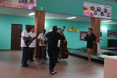 空港の荷物受け取り場所で歓迎のセレモニーだ。陽気だなぁ。
