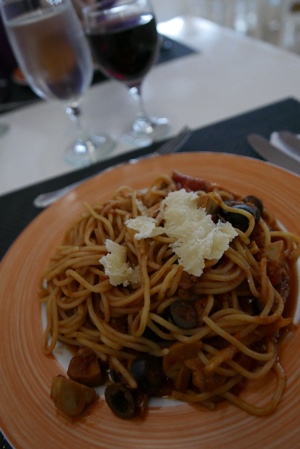 夕飯はブュッフェだけれども、そんなに食欲が無かったのでパスタだけにする。好きな具材で作ってくれるのだ。