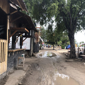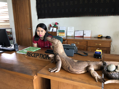 コモドドラゴンの壁画がお出迎え。でも結構雨が降っている・・・。