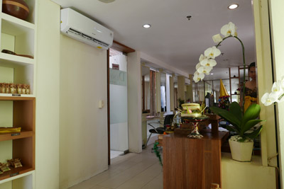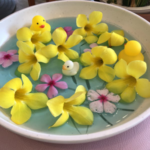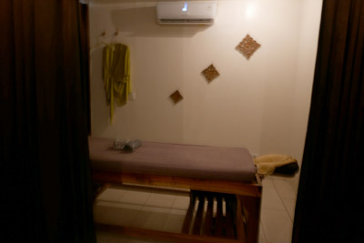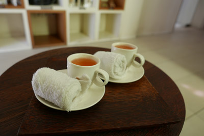 花やハーブなどが入った洗面器で足を洗ってもらい、マッサージ部屋に移動する。
