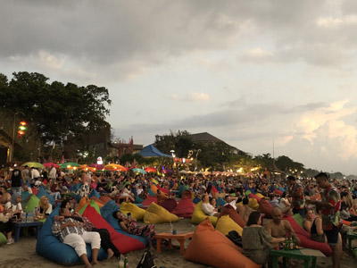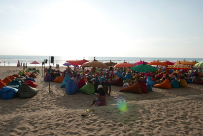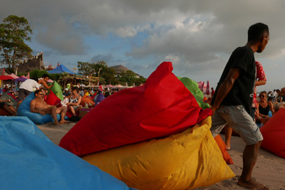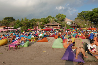 ビーチにはカラフルなクッションが所狭しと並べられており、たくさんの人たちが海を見ながらくつろいでいた。