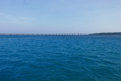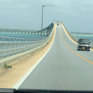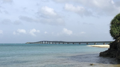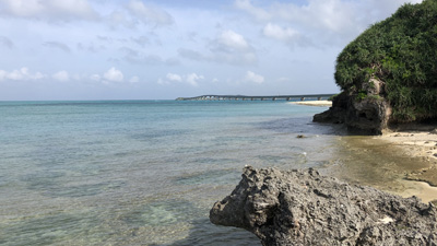 「OHAMAテラス」の駐車場に車を停め、ビーチに降りることができる。誰もいなくてとても静かだ。また、そこから眺める池間大橋も長くてカッコいい。