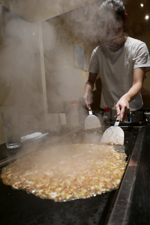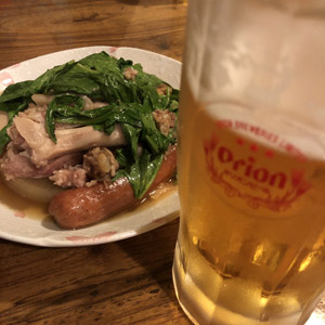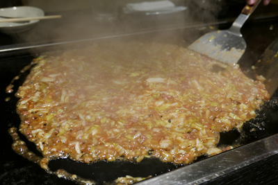 続いて、もんじゃ焼き。オリオンビールによく合う。美味しい。