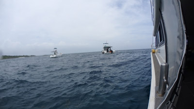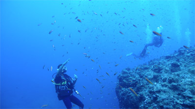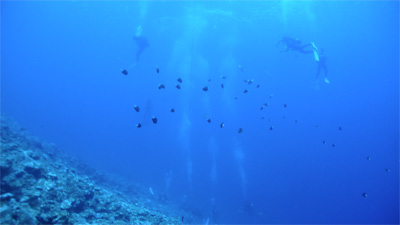 今日の1本目は伊良部島の「ツインホール」というポイント。皆がボート下の集合ポイントまで潜降するのを待つ。