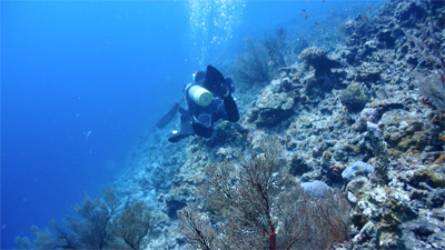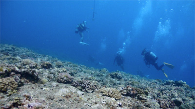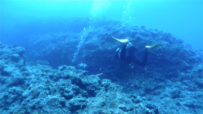 サンゴは綺麗だけれども流れが早くて岩につかまらないと流されてしまいそう・・・。