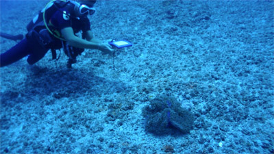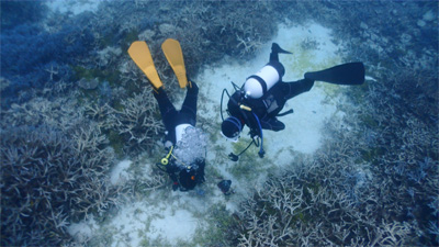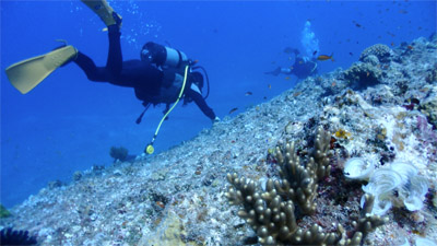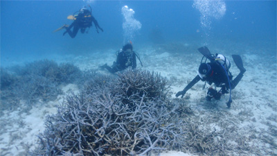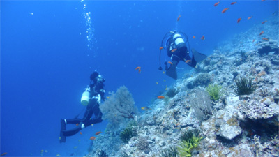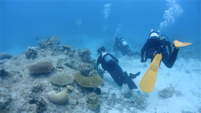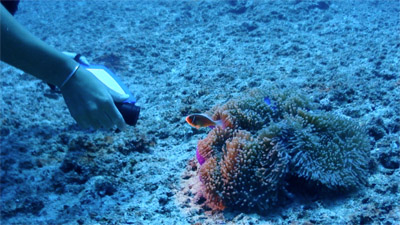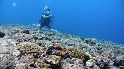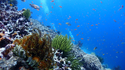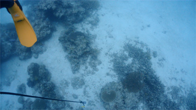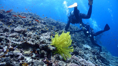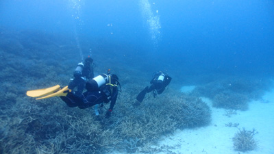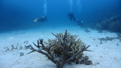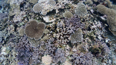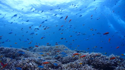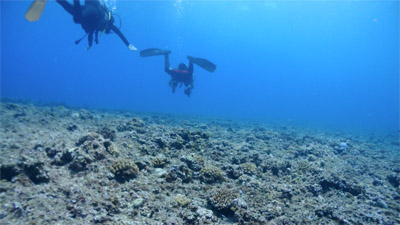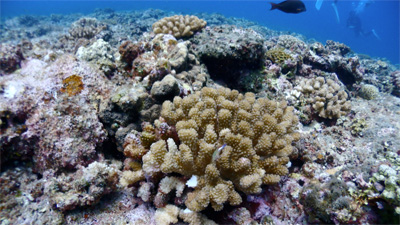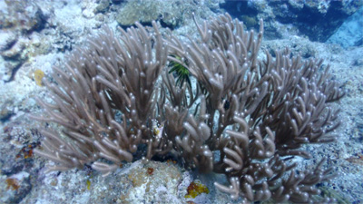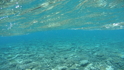 カラフルなサンゴやイソギンチャクは少ないけれども、広範囲に広がる枝サンゴは圧巻だ。