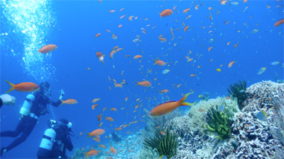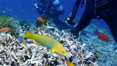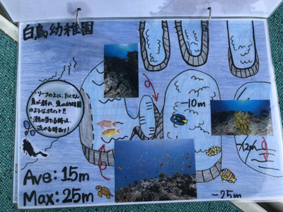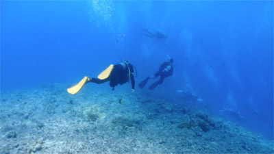 1本目は「ユラビジ」というポイント。魚やサンゴをたくさん見れる人気のポイントらしく、シュノーケルの人たちもたくさん近くにいた。
