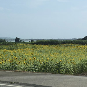 マレアに戻る途中にあった向日葵畑。たくさん咲いている。帰るバスの中でショップの人に出川さんを見かけた話を聞いた。どうやら宮古島で「出川哲朗の充電させてもらえませんか?」のロケをやっているらしい。出川さんに会えるといいな。