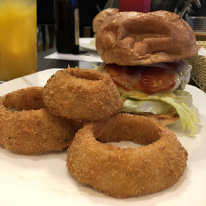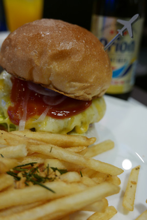 メニューを見ながら、ダグズ・チーズバーガーLAVAとフライドポテト、オニオンリングを注文。ドリンクはボクはもちろんオリオンビール!ちょっと高いけれども肉もチーズも美味しかった〜。