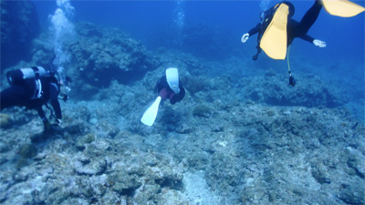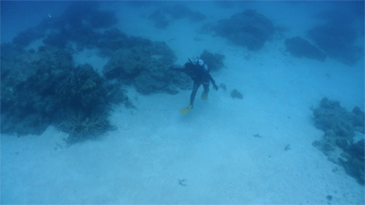 すごい量のサンゴがある。ボクはウェットスーツを着ているので、沈むことができない(笑)。