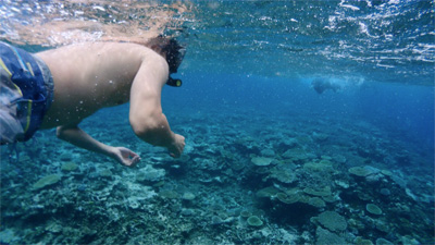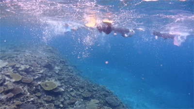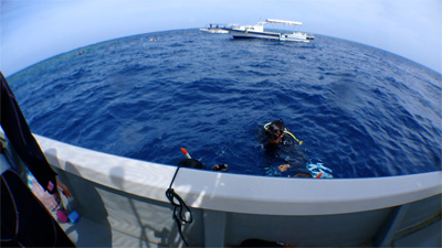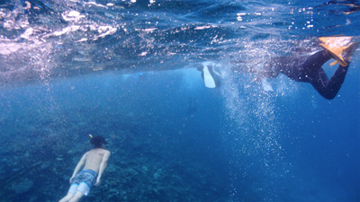 ダイビングが終わった後、ちょっと休憩してシュノーケルをすることになった。ボクは泳ぎが得意でないのでウェットスーツを着たままドボン!