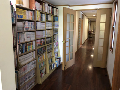 廊下の本棚には漫画がたくさんあって退屈しない。