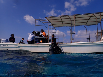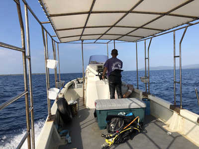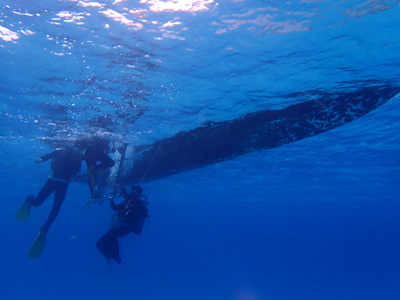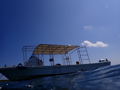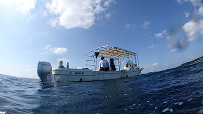 ボートの下で集合して出発だ。水深は最大9mくらいと浅い。