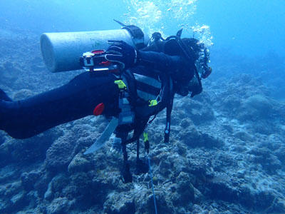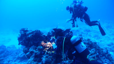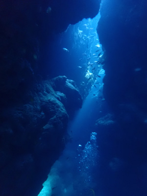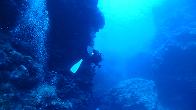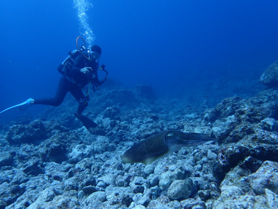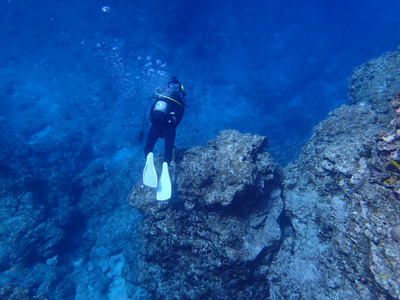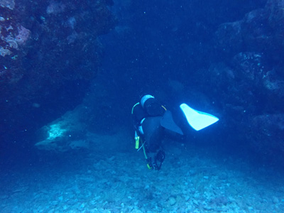 途中、体が入るくらいの小さな洞窟があり他のお客さんは中に入って行ったが、ボクはガイドの黒木さんに言って洞窟はパス。洞窟は怖いんだよね・・・今回のポイントの最大水深は26m。深いな。