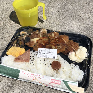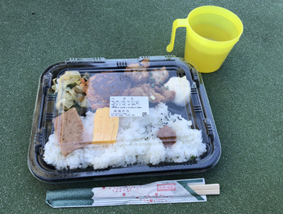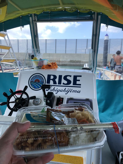 事前に予約しておいたチキングリル弁当。風も波もなく、のんびりボートの上で食べる弁当は美味しい。