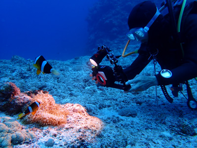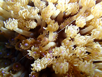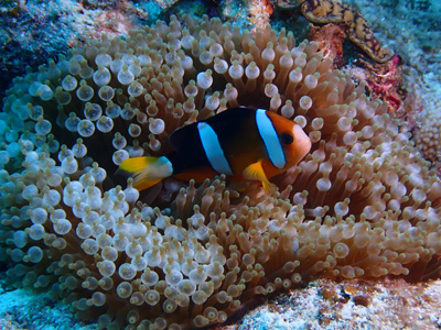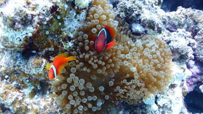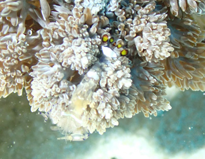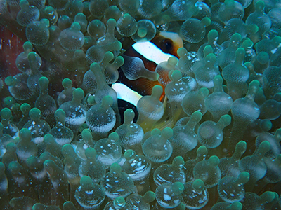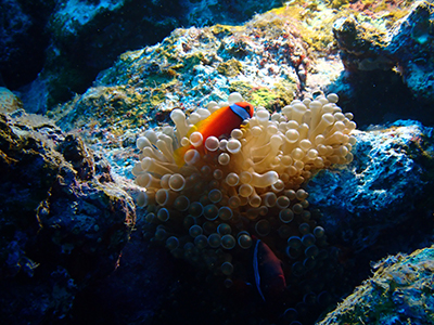 ハマクマノミもいる。ボクは水中ライトを持っていないのでガイドさんが照らしてくれたけれども、ライトがあると本来の色が見えるのでいいね。