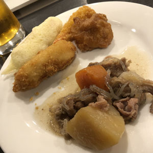 「ホテルみやひら」はJTBのツアーを利用したのだが、3泊以上の宿泊だとビッフェバイキングが1回つくので今日は外には出ずにホテルのレストランで夕食だ。