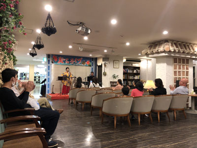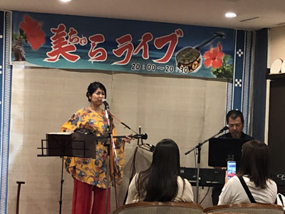 「美らライブ」という催しをレストランでやっていて、歌手が毎日変わるらしい。昨日までの民宿のノンビリ感とはまた違うが、沖縄のナマ歌はいいね。食後はホテルの大浴場に入ってあったまる。明日からは石垣島ダイビングだ!
