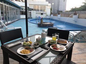 07:30に朝食だ。寒くはないのでプールサイドで食べることにした。そして08:15にホテルでピックアップ。