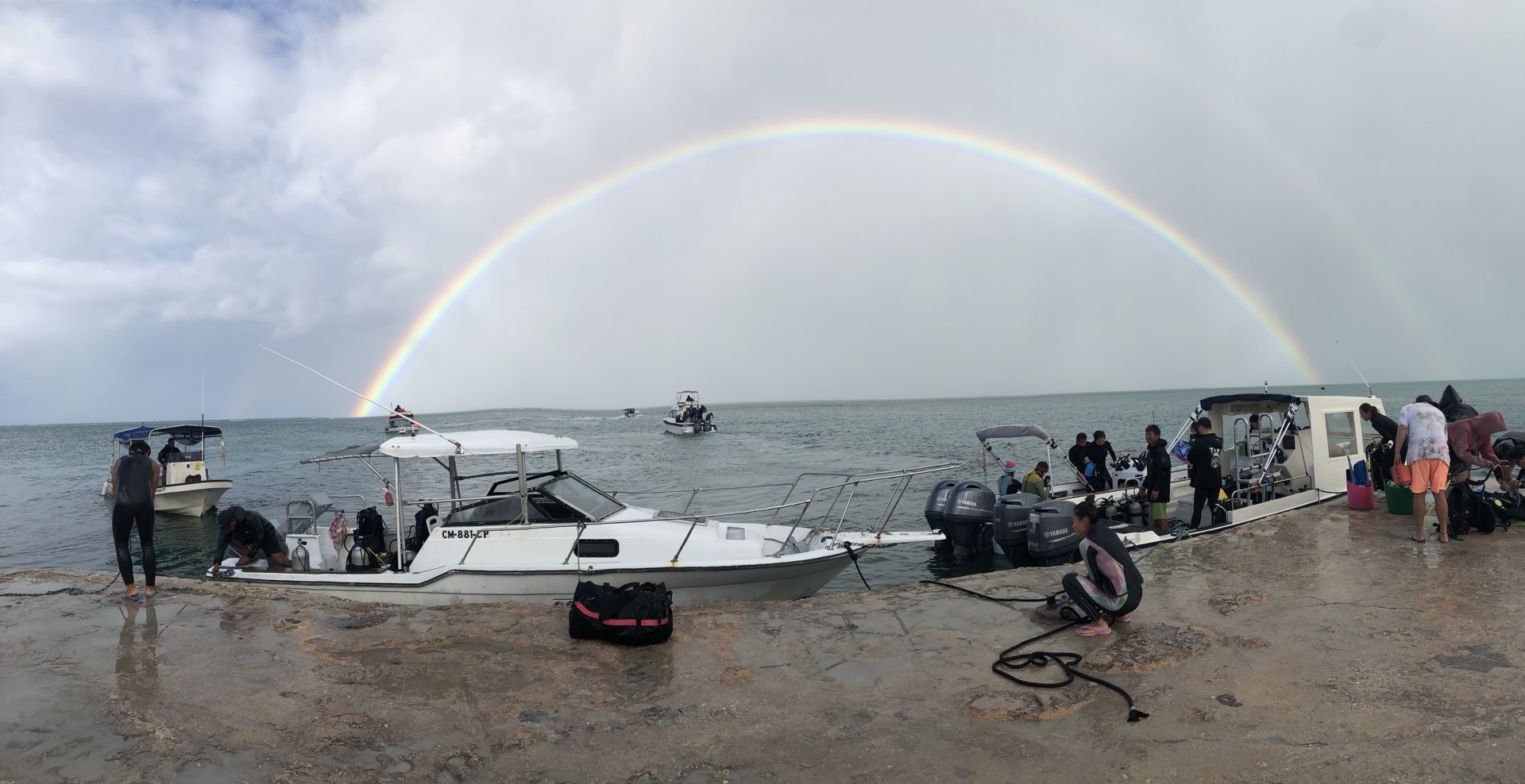 07:45にピックアップ。今日は天気が良くない。だけれども桟橋につくと見たこともないほどの大きな虹が2重でかかっていた。