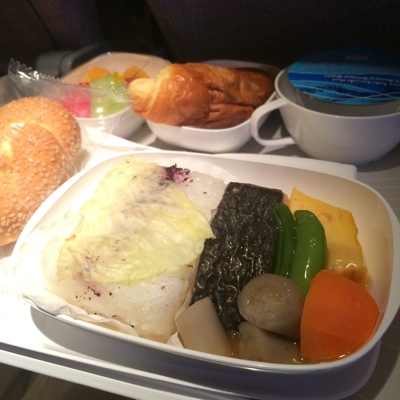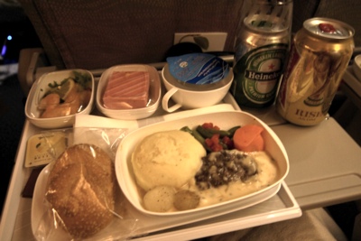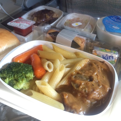 しばらくして今度は夕食にビーフストロガノフを食べる。国際線ってしょっちゅう食事出るよなぁ・・・。
