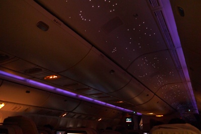 機内の灯りも消えて天井に星空が現れた。エミレーツやるな・・・。