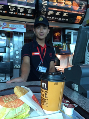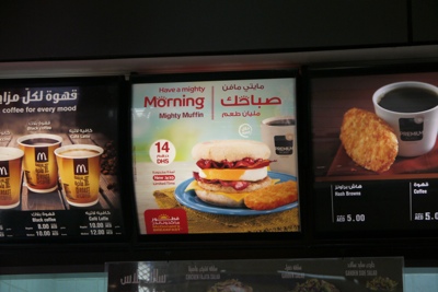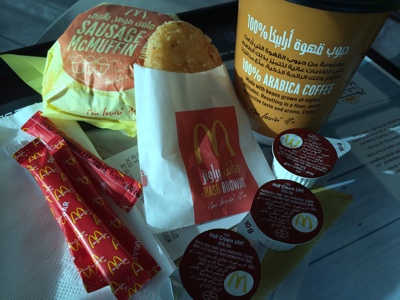 マックを発見。ホント、世界中にあるなぁ。お腹がすいてるので朝マックを食べる事にした。日本にないマイティマフィンを食べる。14ディルハムだから400円くらいか。物価は日本と変わらなそうだな・・・。