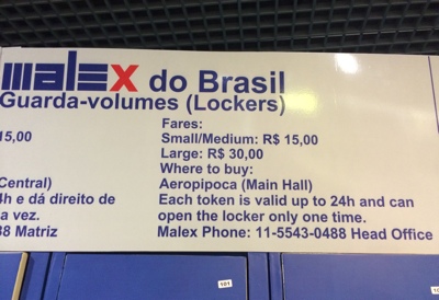 空港に着いてまずはロッカー探しをする。今晩と明日はホテルを予約しておらず空港に泊まるため、明日の試合に行くにはどこかに荷物を預ける必要があるためだ。空港の人に聞いて1階の奥の方にあるロッカーの場所と値段を確認した。ロッカーの横にはX線の荷物検査所がある。ブラジルではロッカーに入れるのに荷物チェックも必要なんだな。