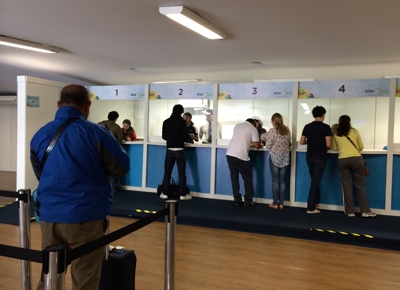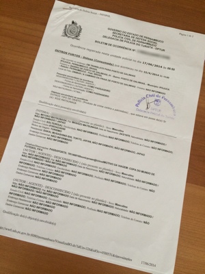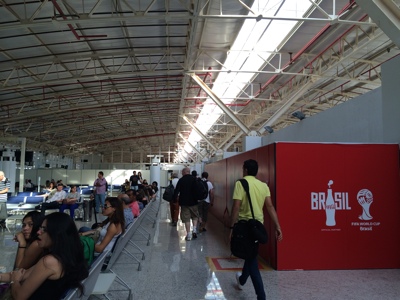 ボク達が買ったワールドカップの観戦チケットは現地(ブラジル)で発券しないといけない。スケジュール的には試合当日のレシフェで発券する予定だけれども発券場所が探せないなど試合当日だとリスクもある。もしサンパウロ空港で出来るのならばやっておきたいのでターミナル1にあるはずのチ ケット交換所を探す。時間が無い中随分歩いて外のバス乗り場付近に仮設してあるFIFAのチケット交換所を見つけた。しかし並んでる人が多く、トランジットに間に合いそうもないのでサンパウロでの発券は 断念・・・。明日レシフェでやるしかないな。