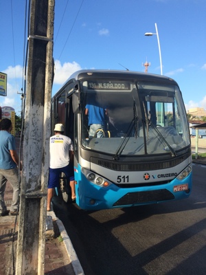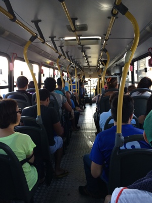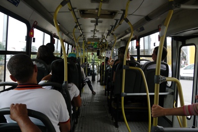 ブラジルはバスに乗るとまずお金を払ってから中に入るゲートを通る事ができる。そのゲートが写真のように回転するようになっておりすごく狭い。乗ったバスは3レアルくらいの安いバスでエアコンがなくて蒸し暑い…。でもボクはこういうローカルな乗り物が好きだ。