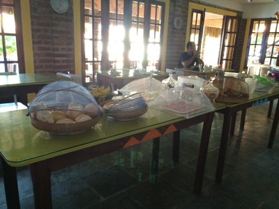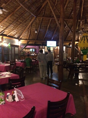 コテージの部屋に荷物を置いてレストランに行ってみる。まずはウェルカムドリンクを飲んだけど甘くてマズい。 何のフルーツだろう?ブラジルは農業大国なんだから100% フルーツジュースを出せばいいのに砂糖がたくさん入ってる。ピラニアのスープは初めて飲んだがとても美味しい。