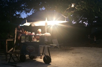 くつろぎ始めてまずは焼き鳥を屋台のおじさんに頼んだ。調理器具を乗せたリアカーのような荷車をビーチの上で引っ張って客の前を行ったり来たり何往復も歩くのだ。ビールはパラソルを貸してくれた海の家(のような店)に持って来てもらう。各エリアではパラソルなどの器具貸しとアルコールはその店が商売し、食べ物は屋台が商売する。そういう風に分担が決まっているようだ。