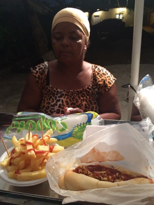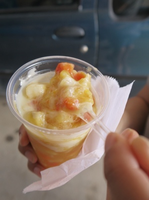 次は大好物のトウモロコシを食べることにした。1本頼んだら3レアルだって。売り子の