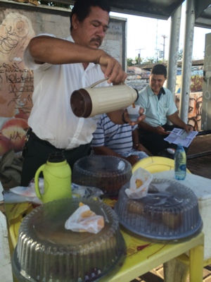 バスターミナルの売店でカステラみたいなパンとドロドロのヨーグルトジュースを買って食べながら待ってい
