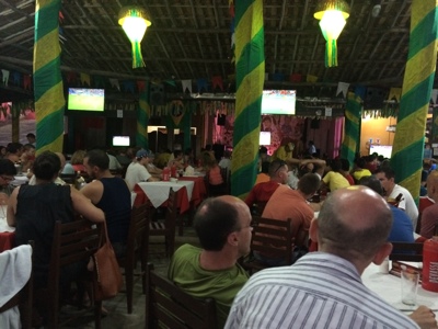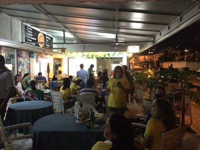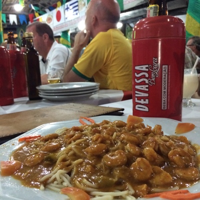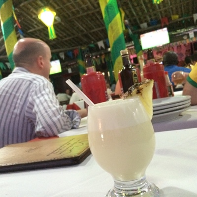ビーチ沿いの賑やかそうなお店で夕飯。店中のテレビにはスペインvsチリの放送が流れている。ブラジルは同じ南米なのでチリの応援をしている人ばかりだ。店の中は結構盛り上がっている。試合をテレビ観戦しながらピナコラーダとビール、エビパスタを注文した。でも