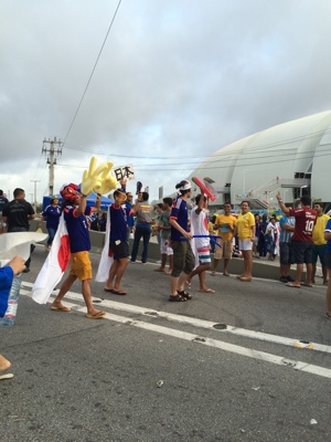 ナタール会場でも交通規制がされ、近くまで一般車両は入れなくなっていた。沿道をブルーのユニフォームを着た人達がぞろぞろ歩いている。いろんなコスチュームの人たちもいて楽しい。