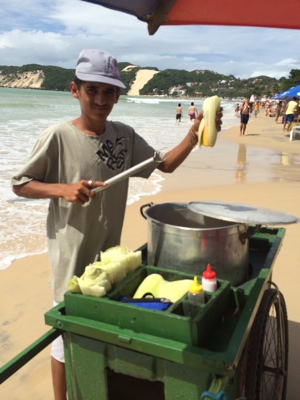 次は大好物のトウモロコシを食べることにした。1本頼んだら3レアルだって。売り子の 兄ちゃんが「2本だと5レアルにするよー」と。毎日観光客相手に商売しているだけあって商売上手だな。2本買う事にした。 バターと塩をたっぷりかけたトウモロコシ・・・美味しくないや(笑)。 やっぱり日本のトウモロコシの方が100倍美味い。きっとトウモロコシの種類が違うんだろうな・・・。美味しくはないけどビーチで日向ぼっこをしつつビールとトウモロコシでブラジルの味を満喫した。ほろ酔い気分には波の音が心地よいや。