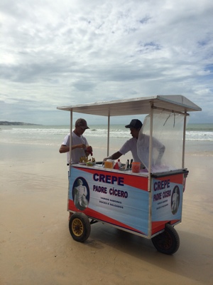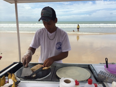 少し泳いだ後に今度はクレープを頼んでみる。12レアル。 エビが入っていて結構美味しい。 日本だとクレープっておやつって感じだけど、 ちゃんとオカズしてる。こうやってビーチで遊んでいるといろんな屋台が来てくれて楽しいな。日本でもこういうシステムがあればいいのに。