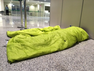 ベンチで寝ようと思ったけれど手すりがあって横になれないので寝づらい。突貫工事で作った新空港ということで お店がまだ出来ていないエリアがあったのでそこに寝袋を敷いて寝ることにする。ちょうど壁で隠れてるし 怒られたらどけばいいや。写真のようにちょっと離れた目の前にガードマンがいるけど何も言わないから大 丈夫かな。灯りが眩しいけど寝袋に潜ってしばらく仮眠(笑)。